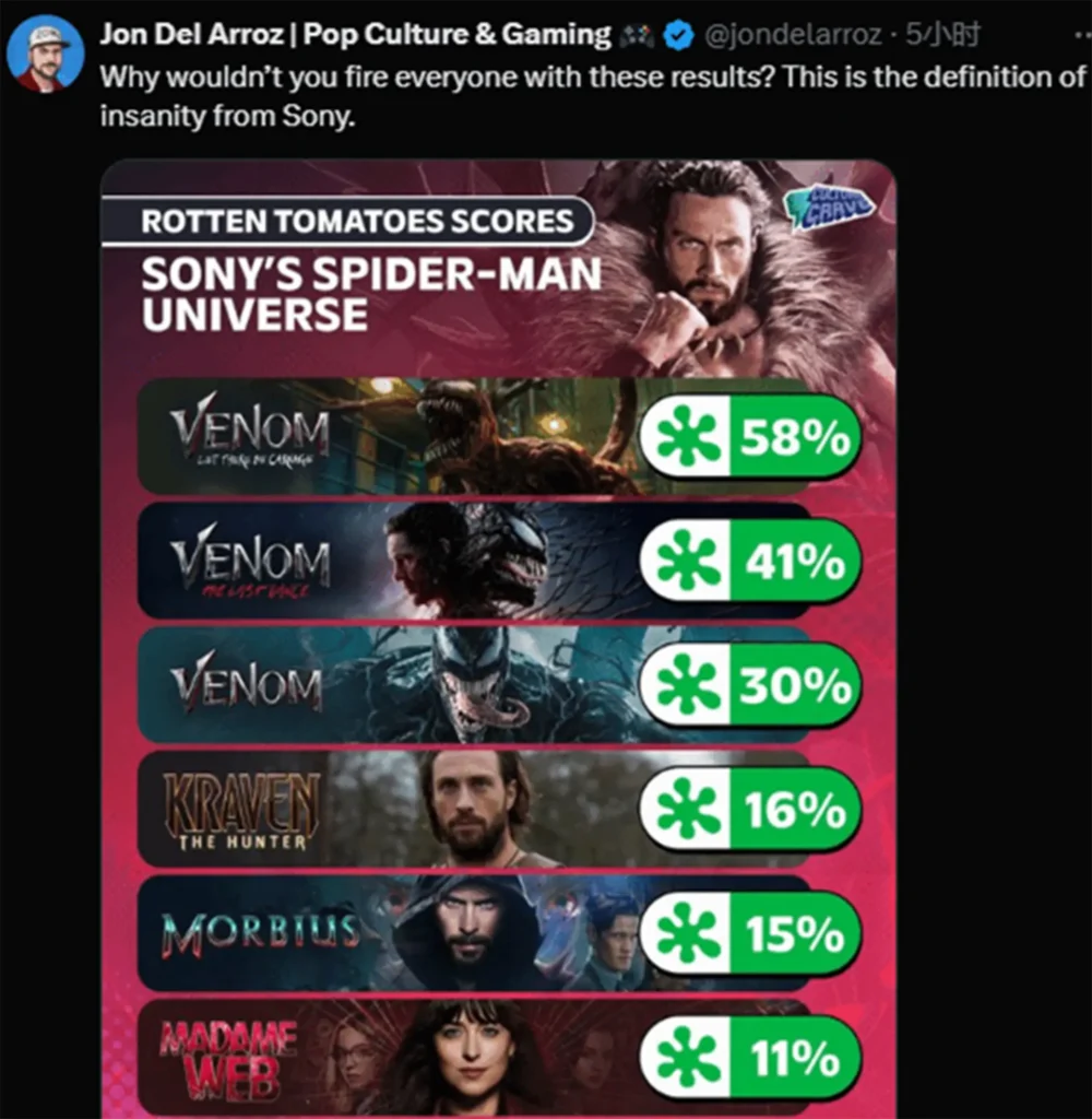 “Kraven: O Caçador”, lançado em 12 de dezembro de 2024, encerrou o universo cinematográfico derivado de Homem-Aranha da Sony. A recepção crítica e do público revelou as dificuldades enfrentadas pela Sony em transformar vilões clássicos do herói em protagonistas cativantes. O filme obteve apenas 14% no Rotten Tomatoes e 33 pontos no Metacritic, números que reforçam as críticas severas à sua execução pouco inspirada e à falta de apelo narrativo.
